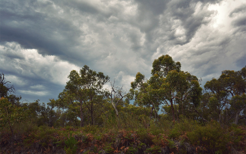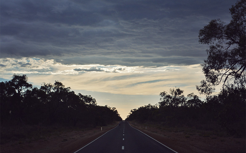 The minutes turn into hours and the storm continues on. The rain and wind will fade for awhile, but they always return. We play the game of watching the lightning flash and counting how many seconds pass until the thunder arrives, and even though this sometimes stretches to fifteen seconds it never goes away either. All of the other thunderstorms we've experienced in Australia have passed in a relatively short amount of time, but this one's big and broad and has nowhere else to be. This means we have nowhere else to go, and so on a dark sandy patch less than a hundred feet off a rural highway we unroll the sleeping pads, and unstuff the sleeping bag. With the smell of burning eucalyptus in the air but no halos of orange visible in any direction we settle in for what promises to be an otherwise unsettled night.