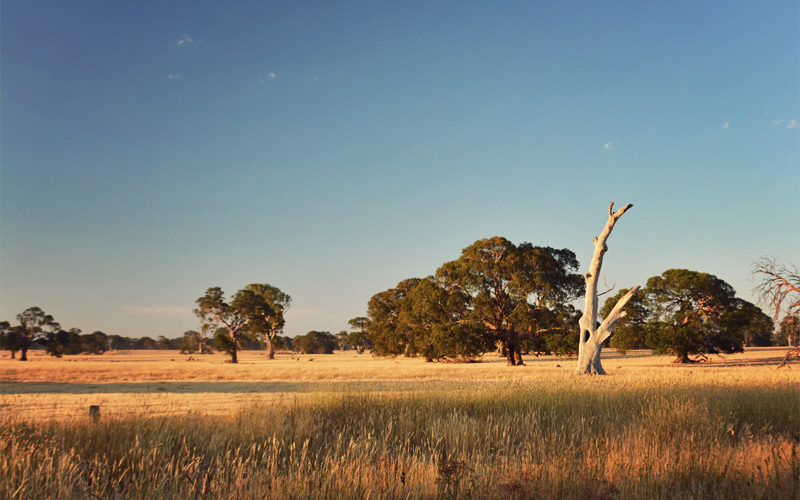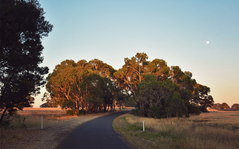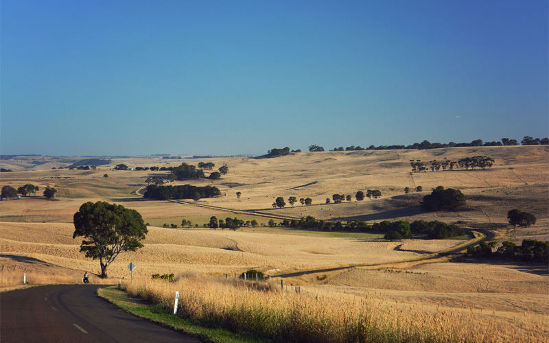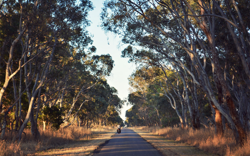 It's a rewarding choice. We ditch the highway and pick up a paved one-lane back road where the only traffic is a pair of loaded bicycles. In the spots where no trees grow the sun hits from straight behind, throwing our shadows fifty feet in front of us. But mostly we ride in the shade of skinny gums, every one of which seems to have at least two screeching cockatoos perched somewhere within its branches. We talk about how with every passing day we're becoming more convinced that there's no more relaxing place to ride bikes around the countryside than rural Australia.