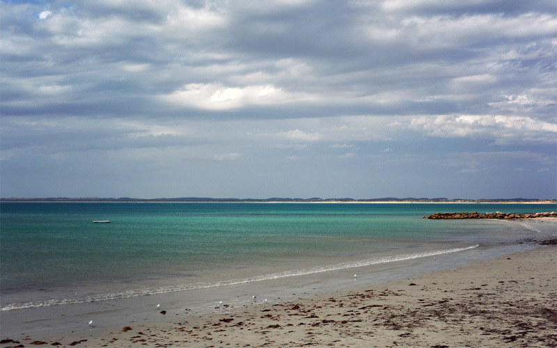 With the exception of the stunning turquoise water of the harbor alongside which Robe hangs like an overpriced barnacle, it's an atrocious place, just as we knew it would be. But we chose to come this way because we wanted a break from the intense heat that's been our companion since we set out from Sydney three weeks ago, and we figured the coast was the only place we were going to find it. In that at least we're successful. Very successful, in fact. Unless we stand in the sun, the cold wind that shoots up from the south at twenty-five miles per hour causes us to shiver and sends us digging through the panniers for another layer or two of clothing.