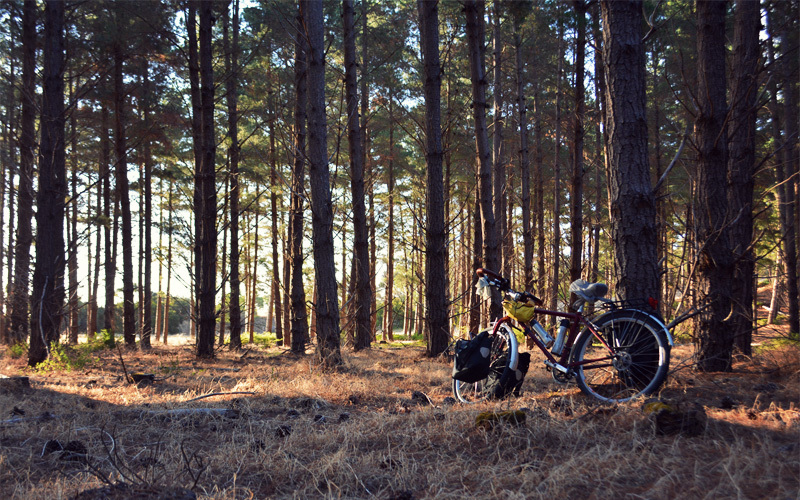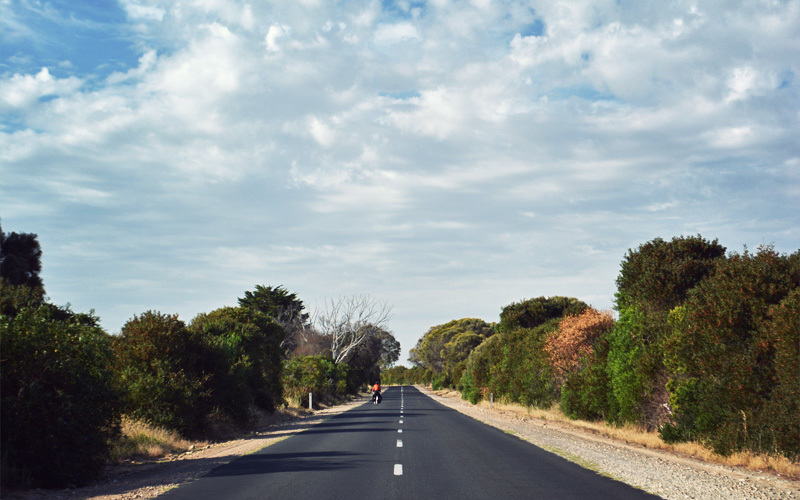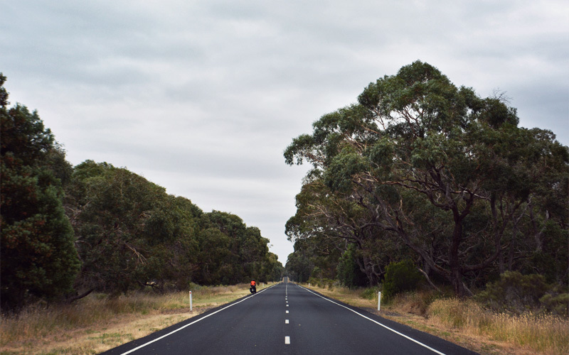 And so, with the smell of salt in the air and a massive tailwind at our backs we bolt. Although we can't see the water, we run parallel to it as we fly north, cranking in the shade of the stubby trees that permanently angle away from the force of the prevailing winds. The traffic that carried us into town has vanished, with everyone heading the other way toward Robe for an overpriced shrimp cocktail or to check into a boutique hotel room they booked seven months in advance. Farther on the trees give way to rolling hills and paddocks, which carry us on to public forest land, where we walk off the highway and into the woods where we feel like we belong.