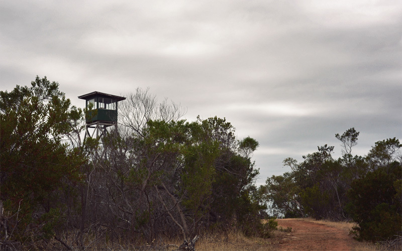 When the tree line stops abruptly we ride beside long stretches of farm land on which we see almost no cows or sheep, just water tanks and windmills and rusted implements older than either one of us. The road we travel runs dead straight for two or three miles at a time, leans through a subtle curve, and then continues straight for another ten minutes before the next bend appears. We see fire watchtowers on the top of the few hundred-foot-tall hills that do exist. Knowing that you must be able to see for dozens of miles in every direction from the glassed-in rooms on the top, we push the bikes toward one on a side road. We imagine some rustic and romantic scenario where we climb up to the platform, set up our sleeping bag, and eat peanut butter wraps and granola bars as we watch thunderstorms roll across the plains below. But when we get there all we find are locked doors both on the ladder leading up from the ground and on the trap door-like entrance to the cabin.