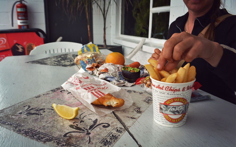 We stop at the roadhouse that is the beginning, middle, and end of the town of Salt Creek. I try to order fish and chips, but when I'm told they're all out of fish I go with the shark and chips instead. It's so delicious that I can only stand to spare a tiny nugget with the awesome little dog who keeps us company as we sit on the front porch, look out on the gray afternoon, and try to decide what to do next.
