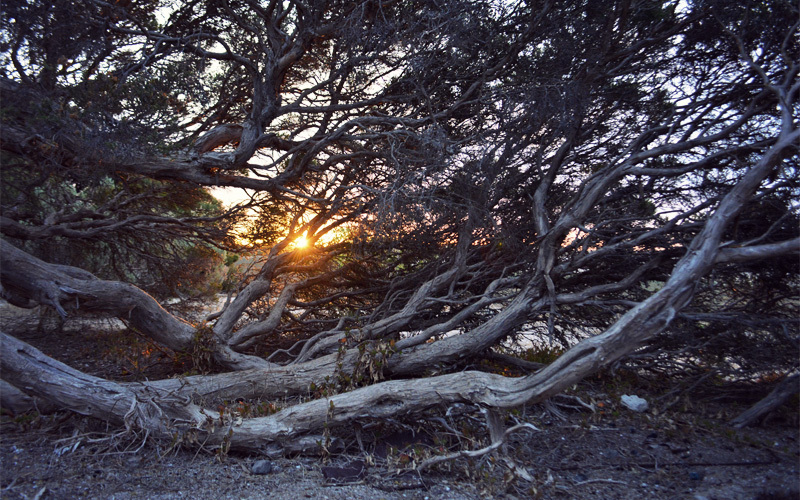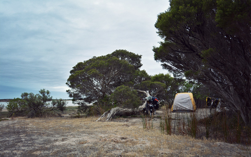 With the wind still giving us a push, and the traffic on the highway having gone home for the day, we take advantage of the cool weather and good riding and keep going. It's a great choice. Five miles up the road we pull off onto national park land, head down a dirt track, and wind our way a quarter of a mile toward the sandy shore of the tidelands. There we find a tent-sized rectangle of dirt surrounded on three sides by the trees, set no more than fifty feet back from the high tide level beyond. In a country full of wonderful places to camp it's one of the best we've so far found.