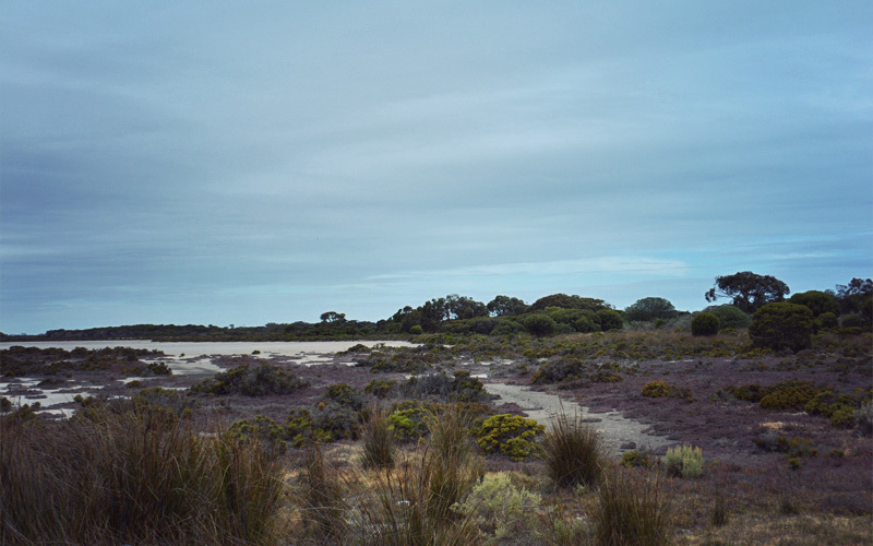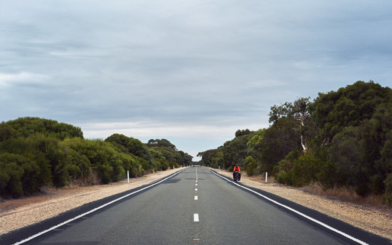 We don't get much help from the wind, because the trees and bushes that follow the path of the road are thick enough that they block most of its force. They also block the view of anything beyond the tunnel of highway in which we ride. Thousands of acres of farmland pass unseen off to the right, while the saltwater marshes and sand dunes of Coorong National Park remain hidden less than a mile away off to our left. It's also the kind of riding where the shoulder is just rough enough and there's just enough traffic that it's impossible to look at anything beyond the road ahead in a meaningful way. We pedal in this way for hours.