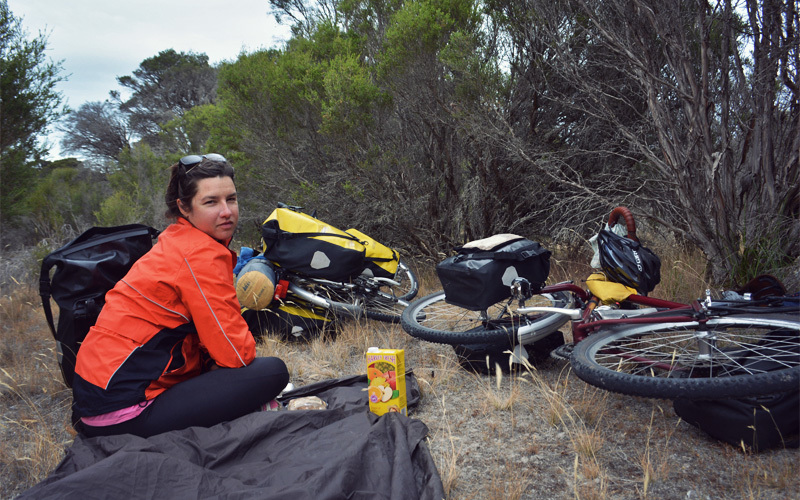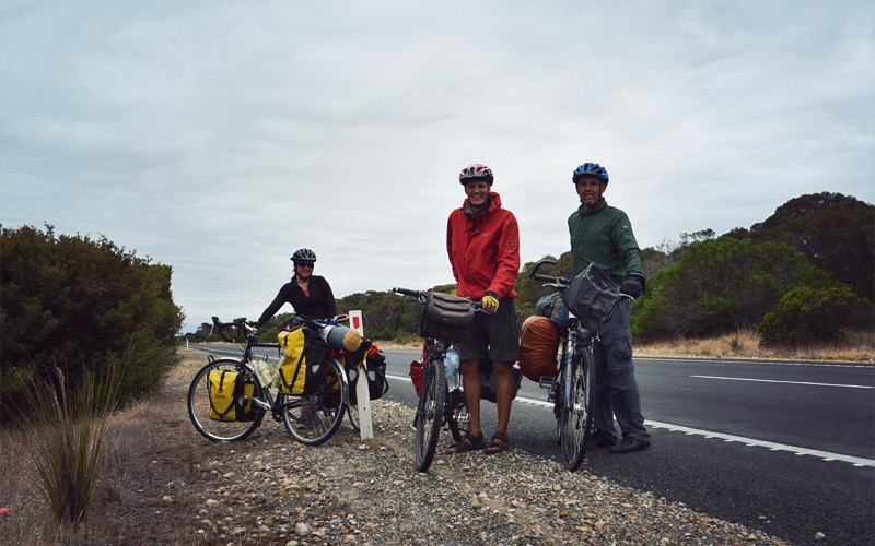 And then, with everything starting to blend together, we see a couple of loaded bicycles headed over the rise in front of us. It's Teemu and Siegfried, a couple of German cycle tourists and the first long haulers of any kind we've seen in this country. Teemu has been on the road since March, cycling through the Stans and Russia and on to China where he met Siegfried, who he's been riding with ever since. Siegfried doesn't speak English at all, so the details of his story will forever remain a mystery, but from what we gather through the noise of the cars and trucks screaming past behind us is that together the two guys managed to conquer the madness of China, then pushed on through Laos, Vietnam, Thailand, and Malaysia. They did a fair bit of this during weeks of torrential rains that turned the roads to mud, while wild camping in areas where land mines are known to still exist, and without using rear view mirrors for a single mile of it. After somehow surviving that gauntlet, they flew into Adelaide a few days ago. Now they're headed on to Sydney before finishing their ride among the hordes of tourists at Queenstown and Milford Sound in New Zealand, where we know Siegfried won't have any trouble finding a German to sit down and have a chat with, although most of them will be shirtless.