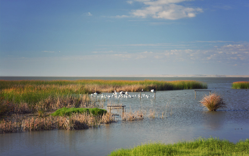 The night passes with heavy sleep. When we wake in the morning, we hear only the crunching of the rain fly on the morning breeze. A walk down to the shore of the bay just beyond the tent reveals two rare white pelicans swimming side by side. Ants by the thousands crawl over the dips and cracks in the ground beneath our feet, moving in the slow, measured way they always seem to during the earliest hours of the day. When we head back to the highway, native vegetation and tide flats fill the expanse of national park land off to our left, while the stock fields on the right stand wide open and empty of cows or sheep. When we pass a roadside motel it's for sale, and has been for a long time. Soon we see small billboard advertising empty building lots being that have been foreclosed on by the bank. In the battle between nature and civilization, out here nature's winning.