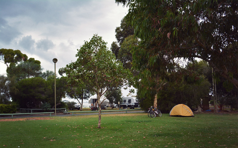 A thick layer of overcast arrives in the middle of the morning and never leaves. The wind slashes through the trees of the holiday park at twenty-five miles per hour with gusts heading past forty. It's a terrible day to ride. With a lot of wide open stretches of heat and dryness ahead of us in the last seven weeks of cycling on this side of the world, we decide to wait it out and use the extra day to rest up, to clean up, and to do important things like celebrate the University of Oregon's blowout loss in the college football championship game.