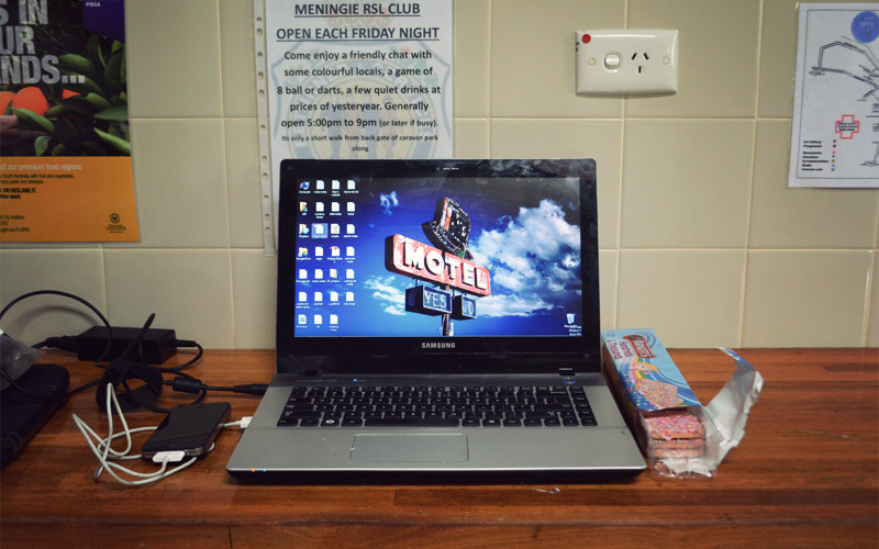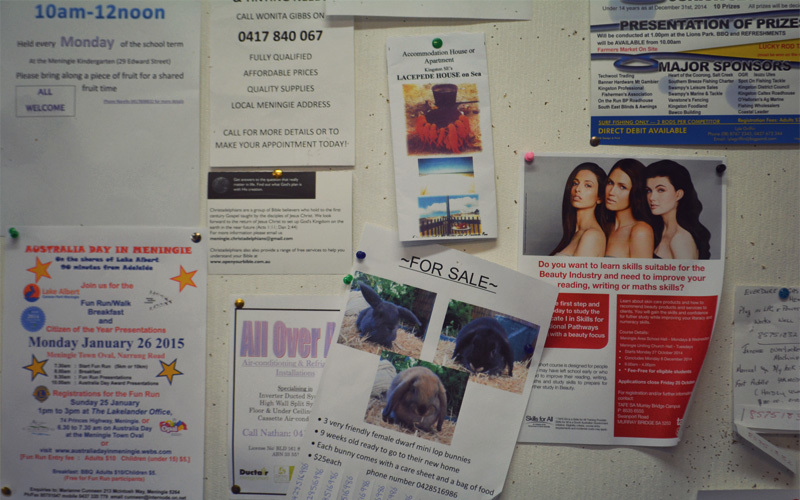 In the afternoon we walk into Meningie, where every business sits on one street, on the minor highway that runs north-south through town. It's a modest place, with one takeaways, one pharmacy, two grocery stores, a couple of motels, a bakery, and a car dealership so small that the showroom has space for exactly two vehicles. It's a world away from tourist-choked coastal towns like Robe, where most every restaurant and shop and clothing store exists for the sole purpose of separating underwhelmed tourists from as many of their fifty-dollar bills as possible. Instead it's a place where the locals welcome people from out of town who are passing through on the highway or who stop for a few days on vacation, but where they refuse to bend over backward in a desperate bid to appeal to them. It's just a good, solid lakeside town, and there are few places in this part of Australia where we'd rather have spent a few days off from the road.