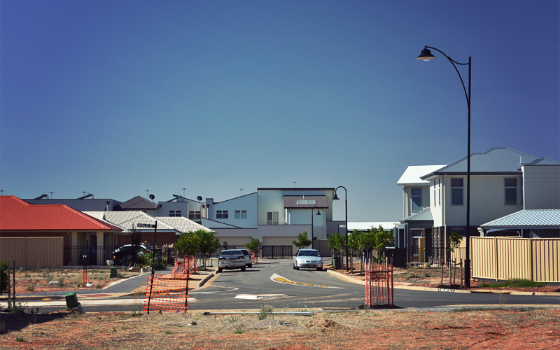 Beyond this point it looks like we're about to return to fields of yellow grass, hay lofts, horse barns, and old men driving pickups at fifteen miles per hour below the speed limit. What we find instead are brand-new neighborhoods that have been engineered into existence. We ride down wide boulevards that are empty because they haven't yet been opened to traffic, and past a massive grocery store and library that are both nearing completion, even though almost no one lives out here yet. At the core of it all are countless small one-story houses of stucco or light-colored brick, all in one of four designs, all with exactly eight feet separating them.