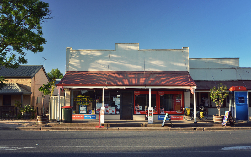 Except for the hunger that creaks and moans in our stomachs. We planned to stock up on food for tonight and tomorrow back in Gawler, but somehow we managed to find the one 20,000-person city in Australia where all three grocery stores close at 5:00 in the evening on a Saturday. That's why even though it doesn't seem likely it will be open, when we see a sign for a general store in the town of Wasleys, population 372, we hang a right and take a look.