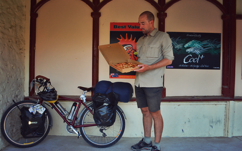 It's dark enough that our headlights and tail lights glow at their brightest settings by the time we drop down into a valley, pass over a river, and roll into Hamley Bridge. On tired legs we crank through town, alongside the cricket oval near the far edge of it, and then set up the tent behind a sheet metal shed where the lawn mowing equipment is stored. With every dog in town barking to each other at the same time and the siding of the shed creaking and popping as the heat of the day leaks out into the night, we crawl inside and fall to sleep straight off.