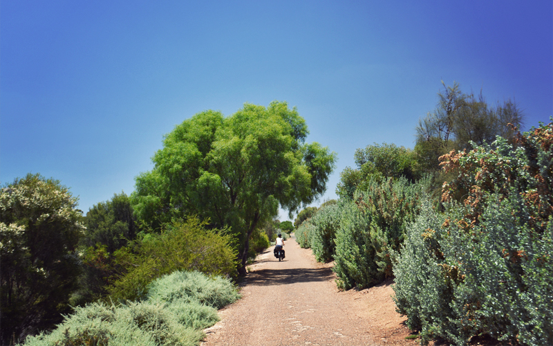But the riding itself leaves little to complain about. Cycling out of a major city is always stressful, but the trek away from the Adelaide area gives us bike lanes almost every mile, pathways through parks, and bike-specific signals at many intersections. The temperature never pushes past seventy-five degrees, there's always a cooling breeze, and it never blows in our faces. It's the best we could have hoped for, and it's easily the simplest escape from a major city I've experienced by bicycle.
