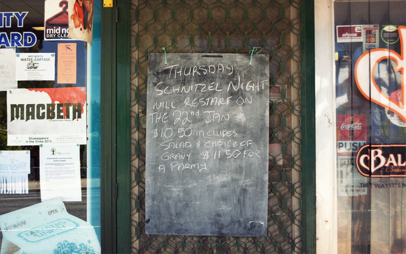 While Kristen and Kirsten head off to run errands and take part in wine tastings at a few of the local vineyards, and Louise is off at her job as a nurse, I spend the afternoon working and also researching the route that will take us to the eastern end of the Eyre Highway and the wide-open stretch of 750 miles that stands between there and the heart of Western Australia. When I take a break, I decide to walk a few blocks over to the general store. Watervale's side streets have no sidewalks, so I walk on the road. But this is just a formality because there's no traffic anywhere. I pet the dogs that greet me at the fence line in front of the houses along the way, then sit in front of the store and watch life in the small town go by in front of me. On this lazy Monday afternoon that means not much more than a few passing cars, kids on BMX bikes buying sodas, and the delivery guy dropping off a few cartons worth of milk.