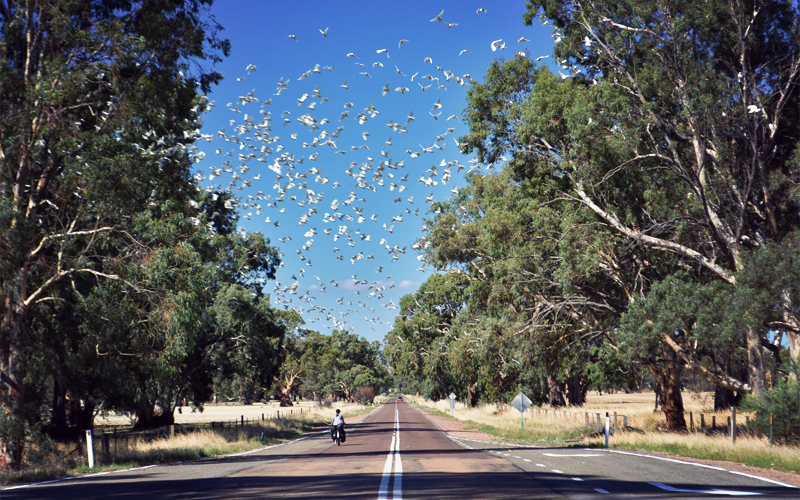 But it's a great place to ride bikes today. The green of the trees on the hillsides contrasts with the yellow grass that surrounds them, giving the landscape more depth and texture and character than it's had all day. For the first time since leaving Victoria we ride in the shadows of gum trees that hang over the road. And when we startle the cockatoos that live in these trees, we send them shooting off into the air where the different groups come together and form a single airborne community at least 200 birds deep, rising and falling and turning in unison. It's a moment so unexpected and so unlike anything we've ever before seen that both of us shout out in amazement at the exactly the same moment, in exactly the same way, and then stare up in wonder, as if it's some kind of reflex that we're powerless to control.