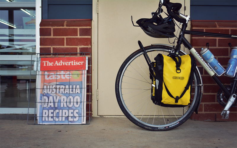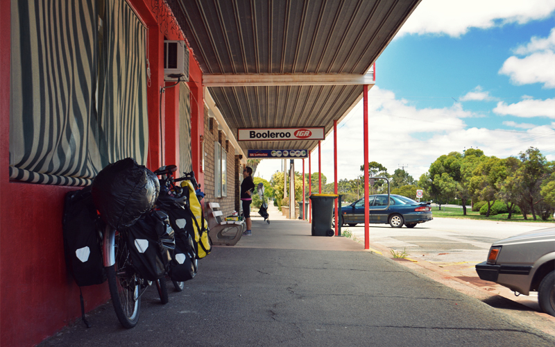 In fifty pedal strokes we're out the other side and back among the wheat and a handful of sheep, clanking across rough bridges that pass over the reddish dirt of dry creek beds. It's a place where we ride for miles at a time without seeing a house, a barn, or even a tractor, because the scope of the wheat fields is so broad. In that way it's more like the Great Plains of America than any place we've yet traveled in rural Australia. We pedal side by side almost always, dodging a lone black and yellow lizard that scowls at us as he crosses the road, and spending hours perfecting our Aussie salute, because the flies are big, the flies are numerous, and the flies land on our eyes and noses and cheeks over and over and over again, to the point that a roadside mental breakdown seems like only a matter of when and not if.