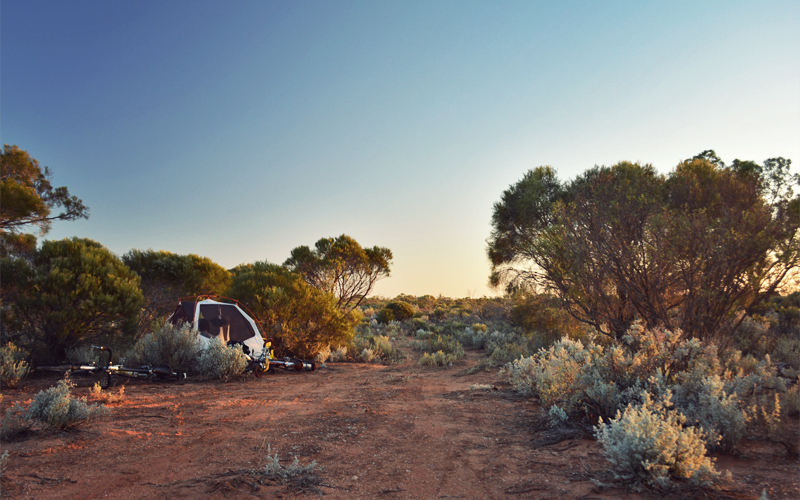 And tonight it's our home. Half an hour before sunset we notice a narrow set of tracks leading away from the highway to the west. We follow them, and a few hundred feet on we find a patch of dirt sheltered from the wind and the view of the highway by a semi-circle of small gum trees and low-lying scrub. Inside the tent we eat dinner to the sound of the heavy breeze swirling through the branches of those trees and nothing else but our laughter.