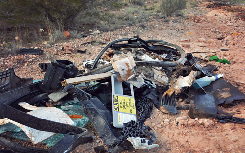 From the charred pavement on the far side of the road we can tell that the car burst into flames after the impact. Beyond that, we see pieces of bumpers, cracked sheets of safety glass in a thousand pieces but all stuck together, a bank of truck of batteries, an oil filter, a sheared-off suspension arm, and a bunch of unidentifiable bits and pieces stacked in little mounds on opposite sides of the highway. Before we started riding this morning we read a newspaper article about the crash, so we already know what looking at the scene would tell you was the predictable outcome: the driver of the truck was treated for a head injury, while all three people in the car are dead.