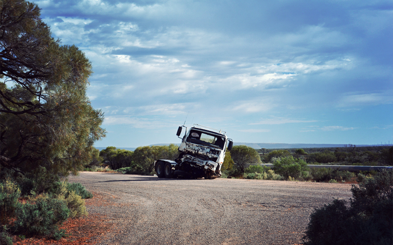 That road runs dead flat, but despite being in what feels like the middle of nothing it's heavy with traffic, because every car and ute and semi-truck headed up or down the eastern side of the peninsula is on this one highway. Paved or unpaved, there's no other road to be found. Along the way we look for signs of the accident that closed the road last night. On the first curve in seven miles we find it, with six orange traffic cones marking the spot of what's already clear.