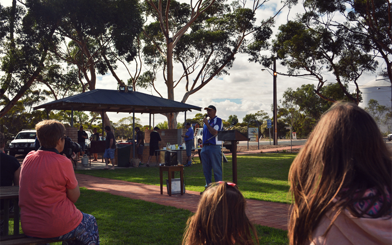 Most of the parents and grandparents have splintered apart into groups of four to six and stand around in tight circles and half-circles. But a few of the people who haven't yet found a crowd to fall into notice us walking into the park looking kind of confused and unsure, and so they walk up to welcome us to Lock and to their Australia Day celebration. At first they express varying degrees of interest, excitement, and disbelief when they find out where we're from and how far we've traveled to reach their town. And then, without fail, each one tells us how it's never this cold here on Australia Day, that they can't believe it's this cold, that they're sorry it's this cold, that it's usually bloody hot around here at this time of the summer, in the way that if you live in a small farming community you're required to talk about the weather with great detail and interest more or less at all times. As we fall into the breakfast line and soon stack piles of meat and bread on our plates, we learn that some of the people attending the event drove from more than fifty miles away. It's a revealing fact; it shows that even though the towns out here might be small, the sense of community that exists in the broader region around them runs strong and deep.