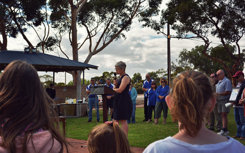 He introduces a woman from Adelaide who was named some kind of ambassador by the National Australia Day Council and has traveled out to Lock to give what we can only imagine is meant to be an inspiring, patriotic speech.