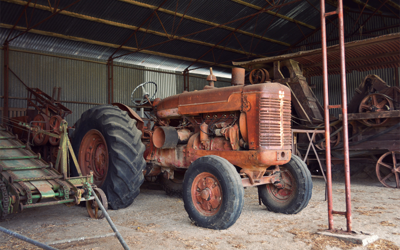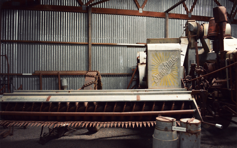 It takes all of a block and a half of riding to reach the museum. It's a small house that used to be the police station. Talking to a couple of the town's long-time residents inside, we learn about how the population of the town continues to shrink as farms grow larger and more automated. Where twenty or thirty years ago a thousand people lived in Lock, now it's more like 300. We also learn that children go to school in town only through the American equivalent of tenth grade. To continue their education after that they have to attend a school in another town or city. But because of the relative isolation of Lock, there isn't another one close enough to drive to and from every day, so they have to go to a boarding school instead. Behind the house sit sheds full of old farm equipment — utes, tractors, harvesters, hundreds of pieces of hand tools — that reveal what life looked like out here when automation was only beginning to take hold.