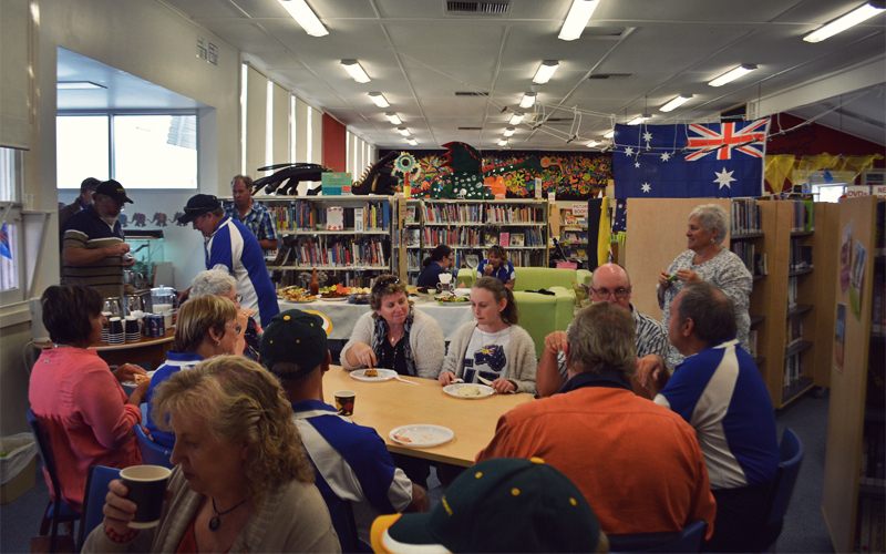 We head into the library half an hour later, where we dive into our second big meal of the day, and where we talk with still more farmers and teachers and retired people who live in the district. It's a festive place to be, with people smiling and talking and laughing out loud as they power through meatballs and salads and Lamingtons and talk in equal parts about farming and their children and local politics. I never thought I'd see people drinking beer in the middle of a library attached to a school, but then again I never thought I'd end up in a town like Lock on a day like this. There are a few non sequiturs, like when we overhear the woman who sits at a nearby table talking about how if immigrants aren't willing to integrate into the accepted norms and traditions of Australia that they can leave and go back where they came from. The heavy irony that she says this on Australia Day, the day where the country more or less said Sorry native people, I know you've been here for 60,000 years and we've only been around for like eight days, but we're taking all of this for ourselves, is not lost on us.