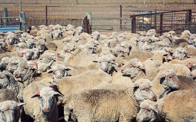 At first the ute moves at a slow and even pace. Ian makes a broad half circle in one direction before turning 180 degrees and making a broad half circle in the opposite direction. This is enough to get the majority of the sheep headed the right way, both because they've been through this process before and also because one of the traits that's been bred into them over decades and centuries through countless generations is the willingness to do whatever the animals around them are doing. With the mustering now set in motion, the three of us sit on the dirt-stained vinyl bench seat of the idling ute — Ian at the wheel on the right, Kristen in the middle, me on the left — and give the sheep time to walk the quarter mile toward the corner of the massive paddock, which almost all of them do.