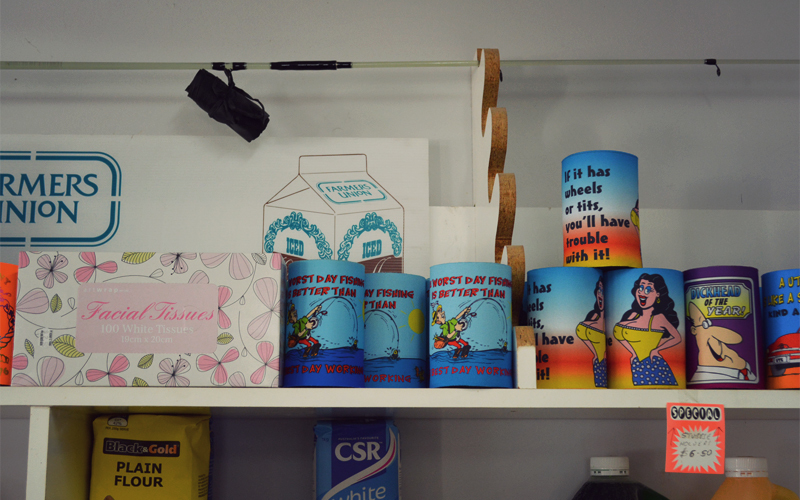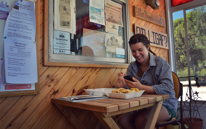 The lingering anger and frustration that we had to deal with a broken spoke in the first place push us the last six miles into Port Kenny in no time at all. There we find a roadhouse with a caravan park attached to the back of it and exactly nothing else. It's the kind of place that has as much in the way of fishing poles, lures, bait, floppy hats, beer coozies, outboard motor lubricants, and hip flasks with sayings like "I drink to make other people interesting" printed down the side as they do of food and water. I'm happy that at least I have the chance to order fish and chips, although when I look behind the counter I see that it's being made in a kitchen that looks like the one you'd find attached to the end of someone's house. On further inspection I realize this is because it is in fact a kitchen attached to the end of someone's house.