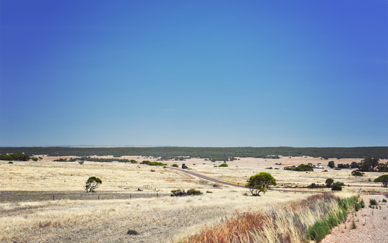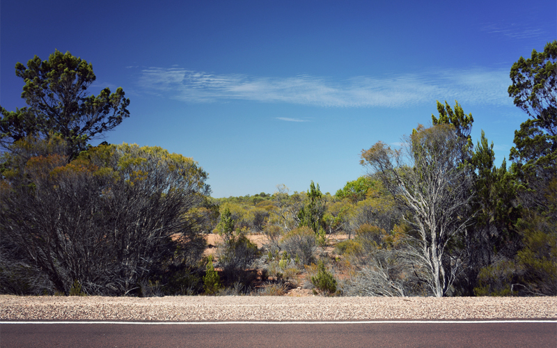 The dull yellows of the hills and the ruddy gray of the pavement become afterthoughts in an instant when we find ourselves riding into a long stretch of native bush on state conservation land. That's where the explosion of green that extends in all directions as far as the eye can see takes over, and where we can imagine what this part of Australia looked like before the wheat fields and sheep arrived. And that's what I'm looking out on when it happens.