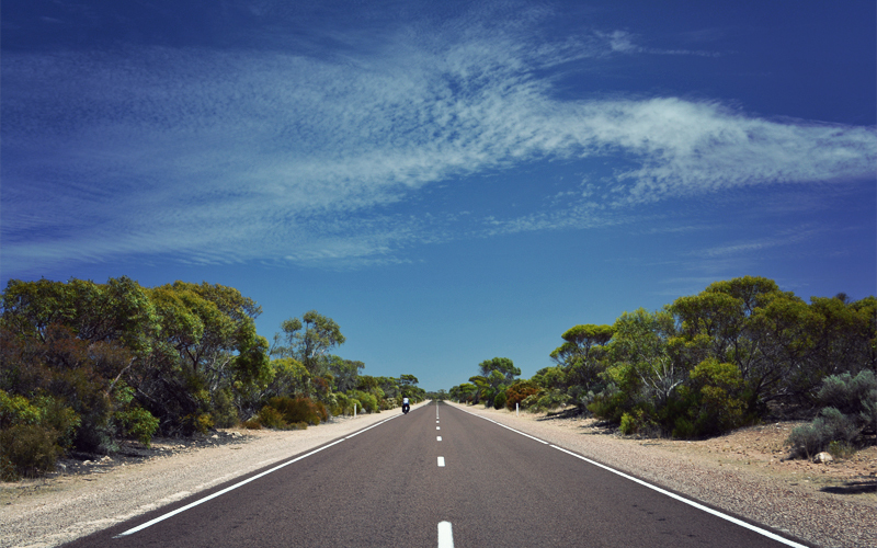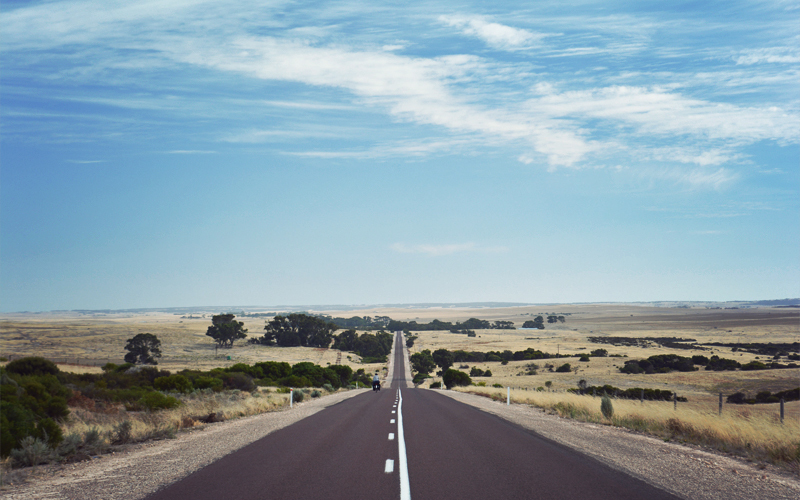 The road trains are asleep on this Saturday morning, tucked in some distant dusty lot far from the highway, and I picture the utes standing idle next to the back doors of far-off farmhouses with herding dogs laying in the shade cast down by the bed and watching the world move slowly past. We ride for miles at a time without seeing any of these farmhouses, and when they appear again they're always set far enough back from the road that all we can see of their features are rough outlines. The highway meets what we've decided is the first and most important requirement of any rural road: there's so little around that you can take a leak wherever you want, without having to worry about a passing driver or a nearby homeowner watching you whip it out along the edge of the shoulder.