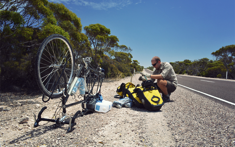 I wheel the bike a few hundred feet back the way we came, push it up a side road we just passed, and then we walk off into the bush. While Kristen sets up the tent, I go through the dance of unloading the bike, flipping it over, and removing the back tire from the rim. There's a wide hole near the valve, so I throw a few patches on it with as much speed as I can, remount the tire, pump it back up, and all but fall exhausted onto the dirt-stained sleeping bag in the tent. The day has taken everything out of me.