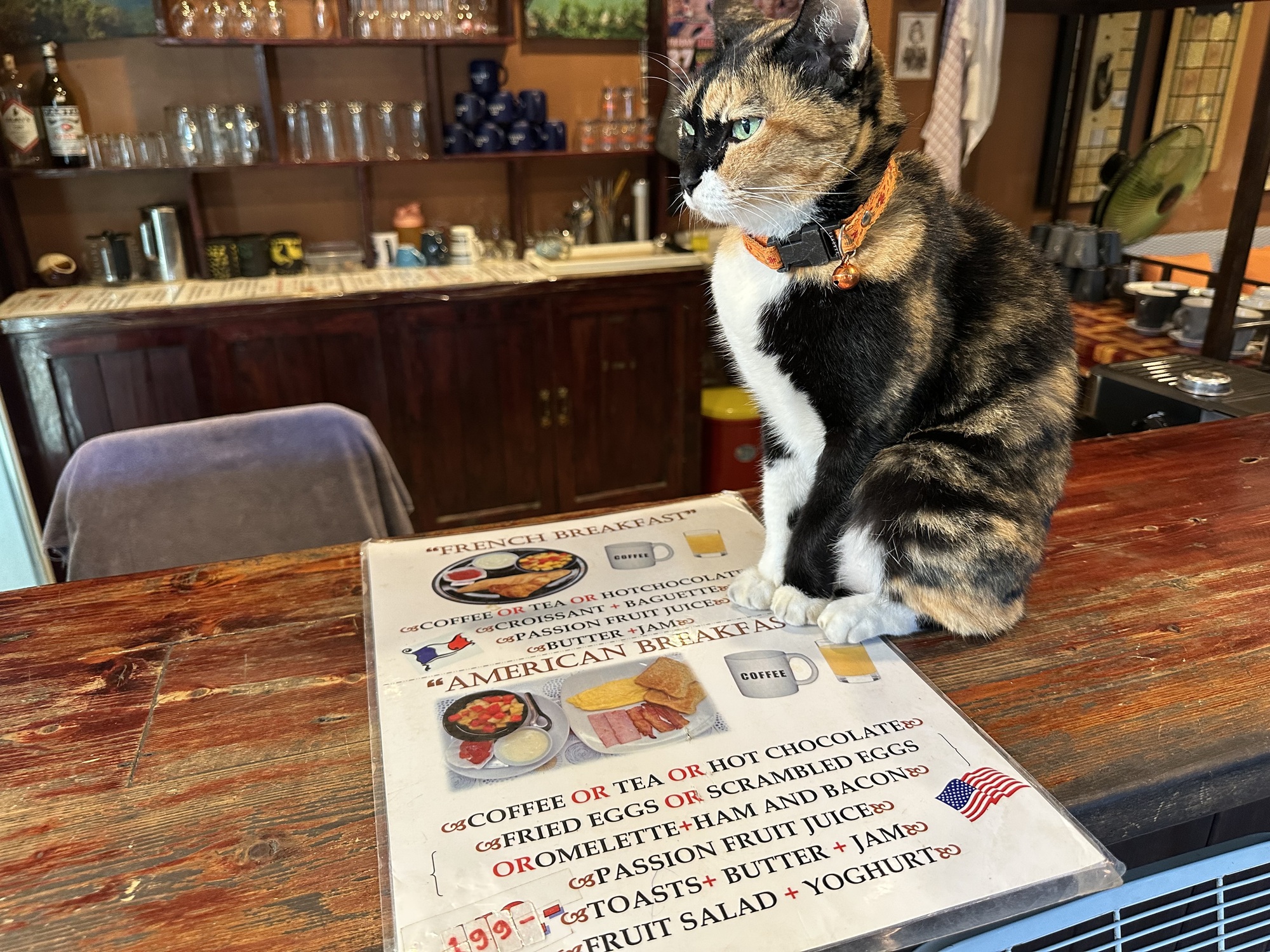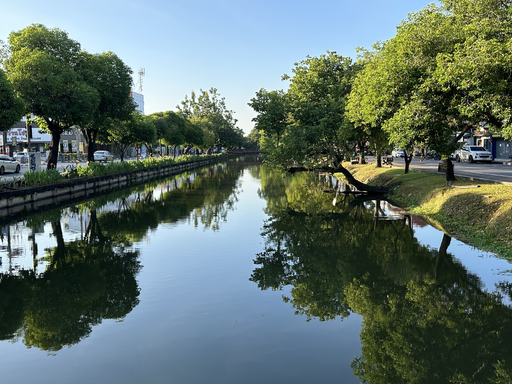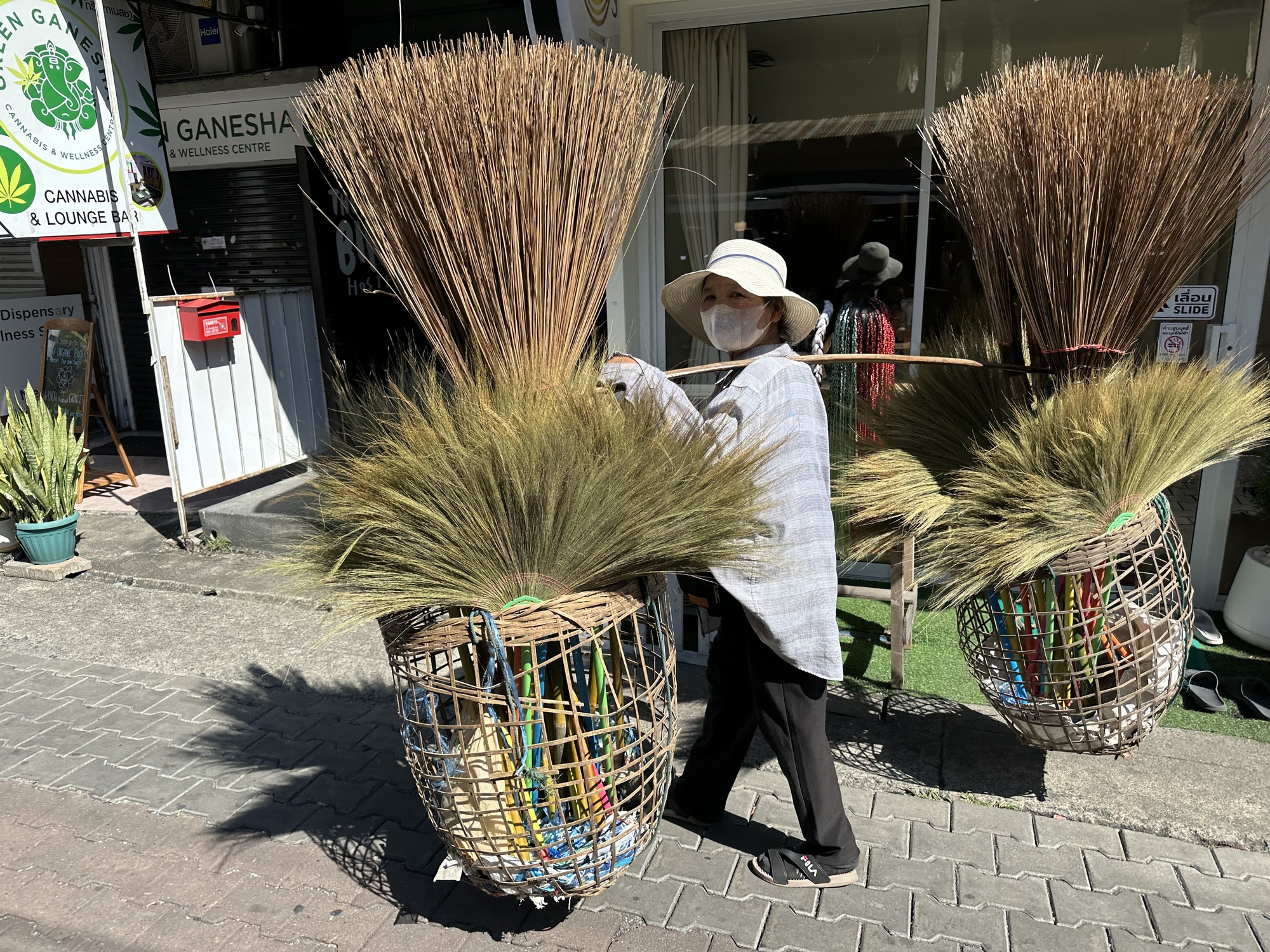 The soi (small street) we are at is beautiful. Trees and flowers and plants and little restaurants and this and that. The sky was clear blue. And we were hungry and didn’t have a single baht between us and the money changer didn’t open until 8:30 so we took a walk instead. Sunlight is a good first step for chasing off the jet lag. Our feet weren’t doing any chasing though, more like stumbling off the plane wooze and remembering that in Thailand, you need to keep an eye on your walking surface.