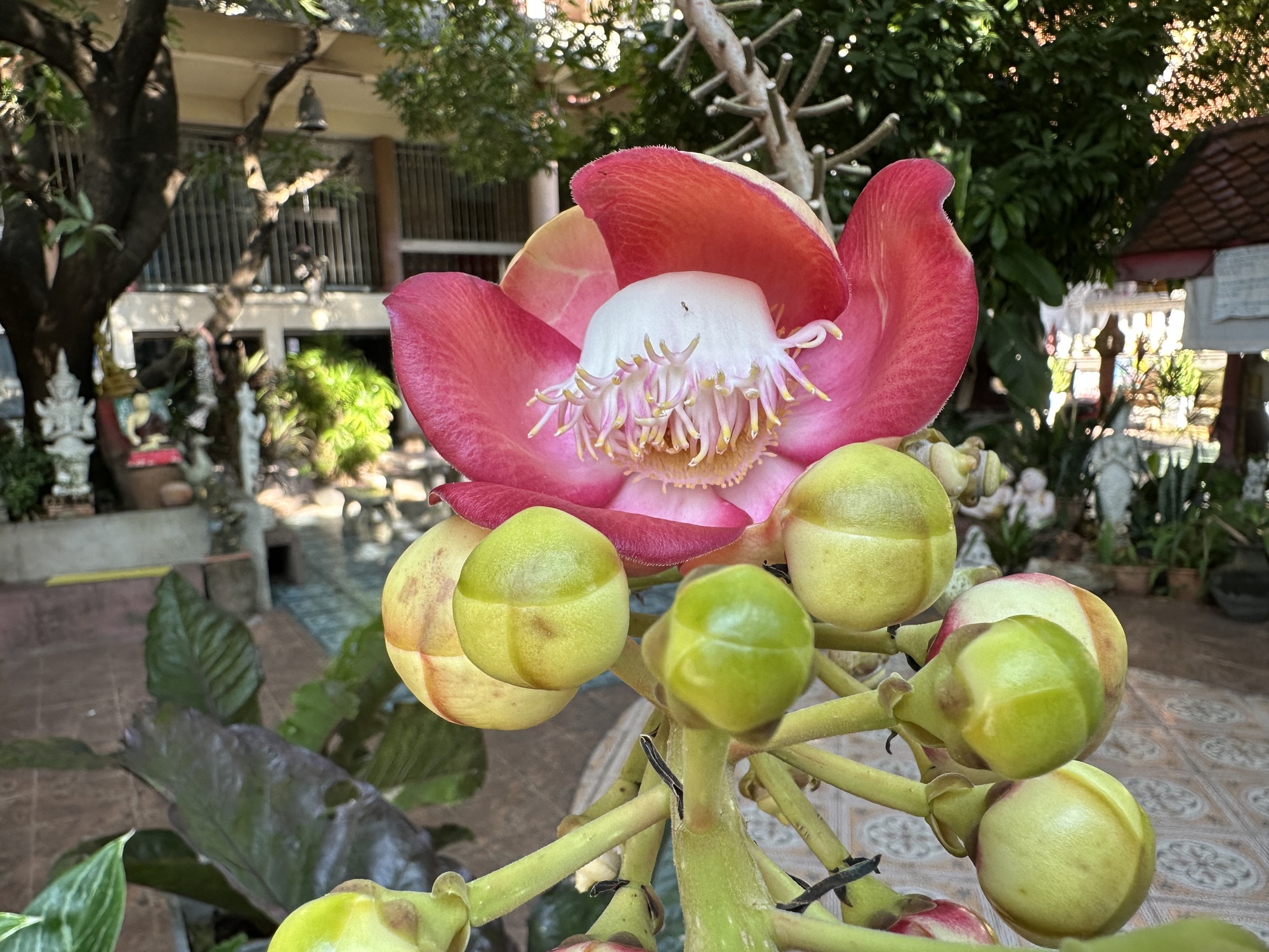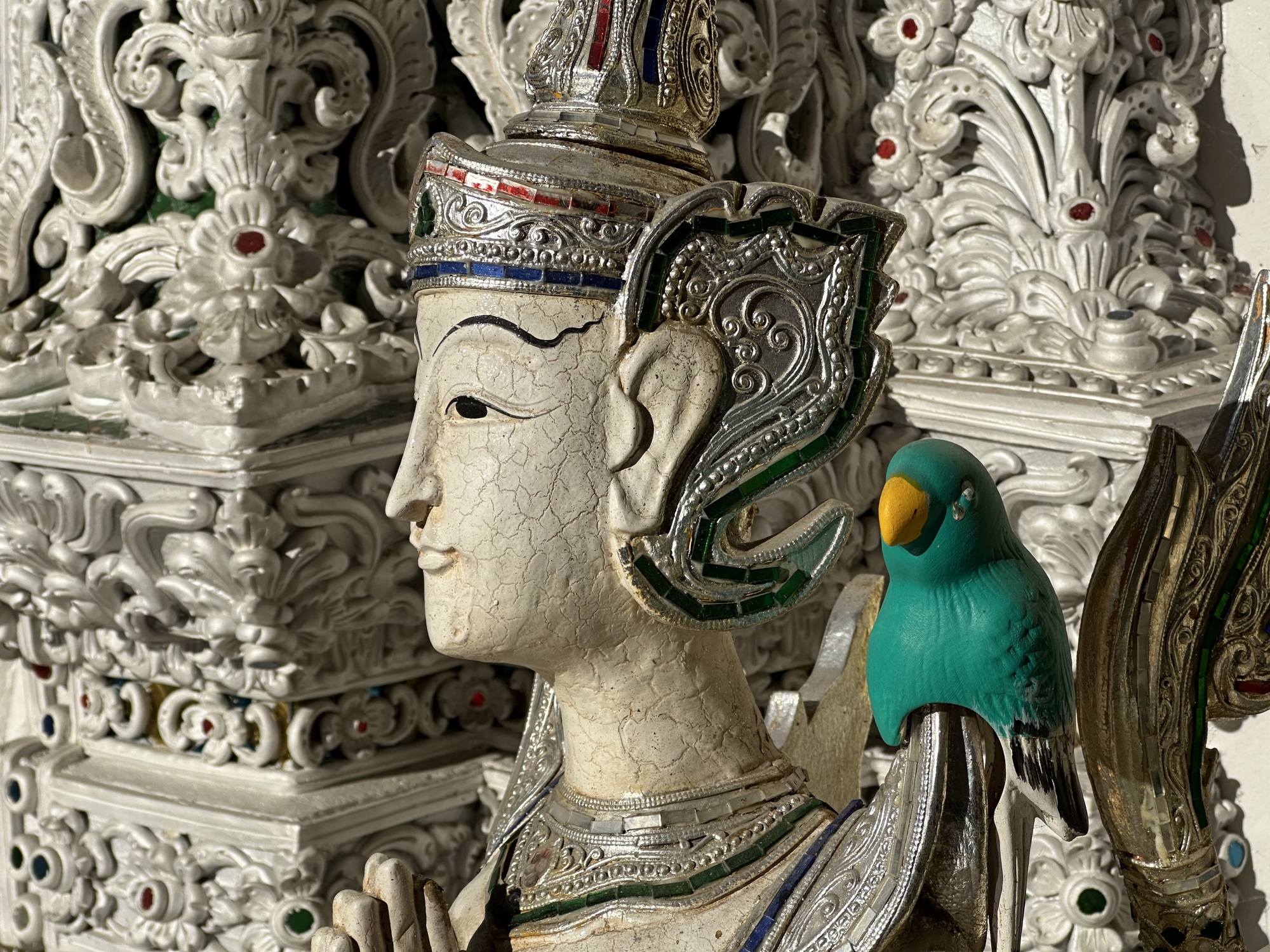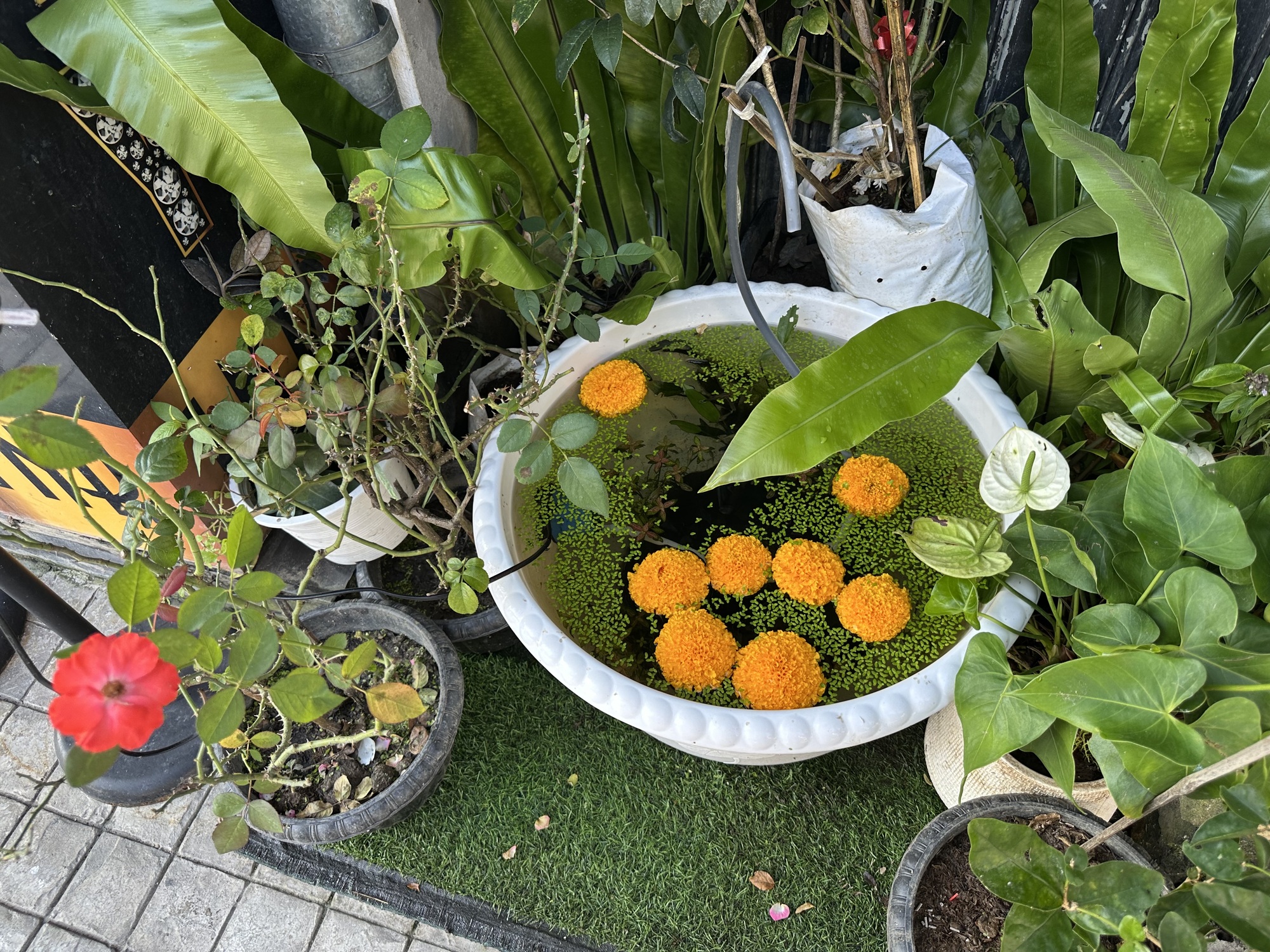 We entered a temple grounds that we’d never been in before. I sat on a bench surrounded by flowers and goofy cement figurines and listened to some of my favorite birds. Elderly women wearing all white were padding around. There was a little breeze. Yes. It’s hot and I’m sweating every minute and that will be the case for the next four months so maybe I can just get that out of the way, all the complaining.