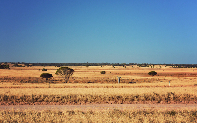 The shoulder turns narrower and the traffic even less frequent as the grain elevators of Penong become smaller and smaller behind us. We pass a couple of sprawling family farms, of the the kind with millions of dollars worth of buildings and equipment arranged in no pattern, all standing idle at this time of the day. But mostly it's smaller sheep and wheat farms set among the fields that glow golden and stretch off into forever. Every ten or fifteen minutes a bright yellow road train with three trailers roars past in a rush of downshifting fury on its way to or from a mine somewhere to the west, and in between we pass dozens of plastic bottles full of urine that have been chucked from the open windows of passing cars and now sparkle back at us from the edge of the shoulder.