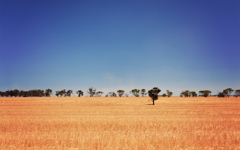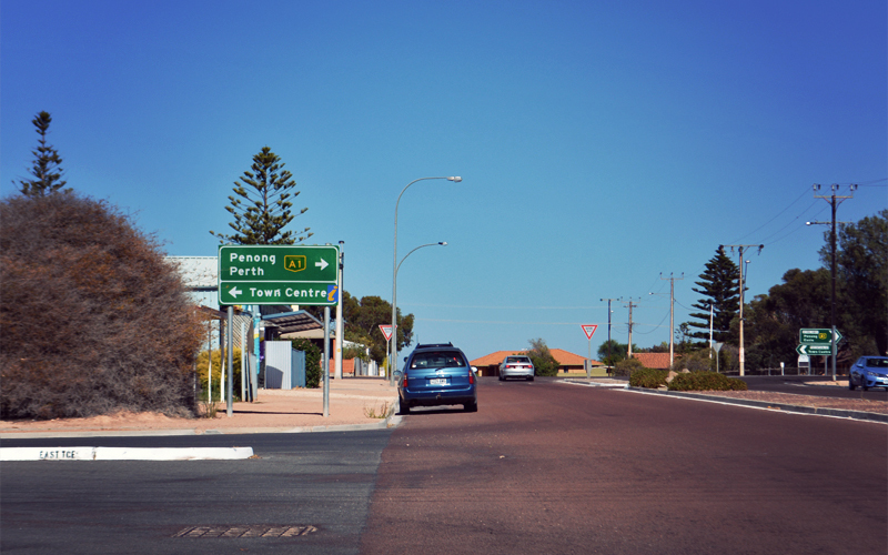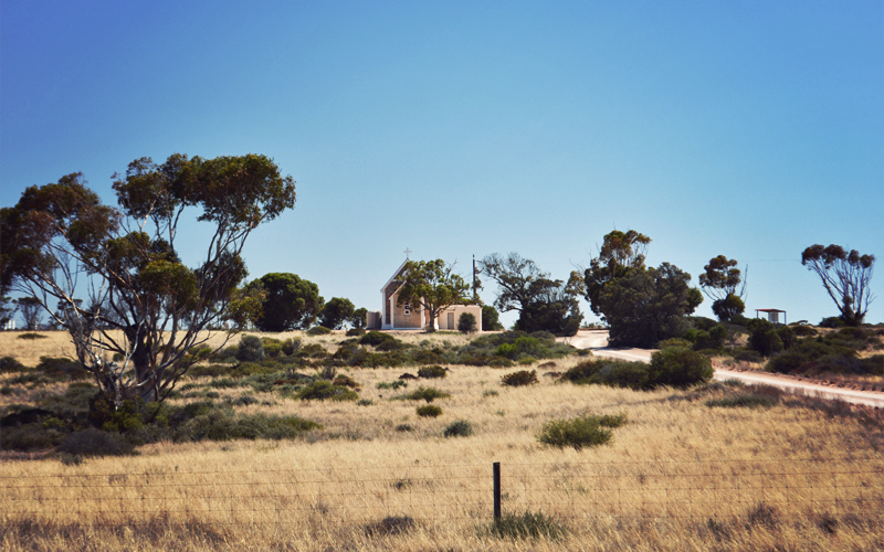 We roll out of Ceduna just after 10:00. Five miles in we're passed by our first truck, a massive three-trailered thing with yellow signs on the front and the back that read Road Train. Against the warnings that at least half a dozen people have given us, we aren't sucked into its jet stream and then dragged beneath its wheels for an unfortunate and blood-spattered death. We just move over a bit to let it pass, the driver does the same, and then we both continue on into the countryside all alone. This countryside turns out to be just like where we've been for the past week and a half: small patches of gum trees paralleling the road, rolling hills turned golden by the wheat that covers every arable square meter, abandoned barns in the distance, and the cobalt blue of the sea visible in a thin line at the horizon when we reach the tops if the tallest rises. And unlike what we've read and been told, there's a two-foot-wide shoulder that follows us almost always, which makes it easy to get out of the way of the few cars and trucks and caravans headed west on this beautiful summer morning.