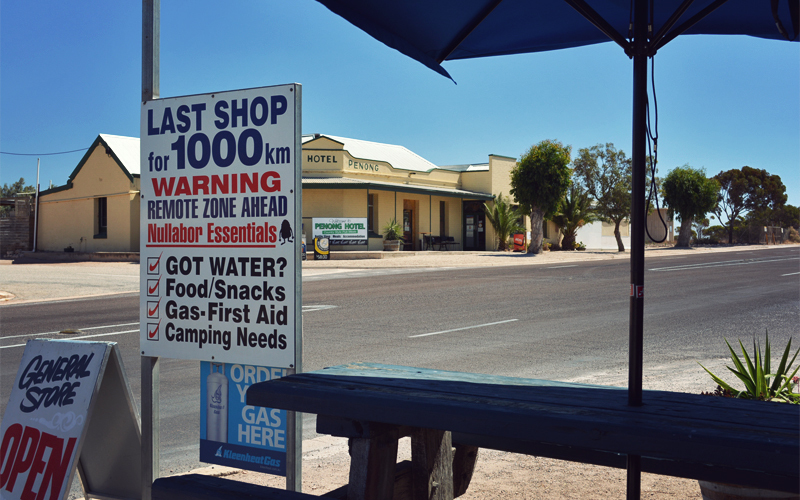 It's kind of anticlimactic heading west from Ceduna, because even though it feels like we're pedaling out into the vast outback of Australia, we roll into Penong less than fifty miles after our grand sendoff. We've had at least a dozen days with bigger distances between towns than that since leaving Sydney. But as we sit on a wooden bench in front of the last proper grocery store we'll see for more than 600 miles, it starts to hit home that Penong really is the end of the line for civilization for the next week and a half. There's a roadhouse in Nundroo another fifty miles up the road, but the water there comes from underground and it's too salty to drink. That means we have to load up with almost twenty liters of water between us to make sure that we can cover the 142 miles that stand between Penong and the next water source at the Nullarbor roadhouse.