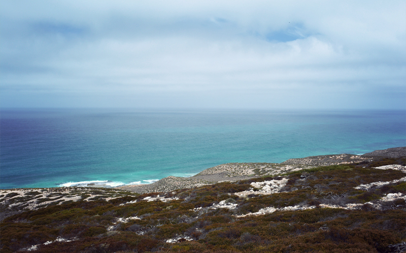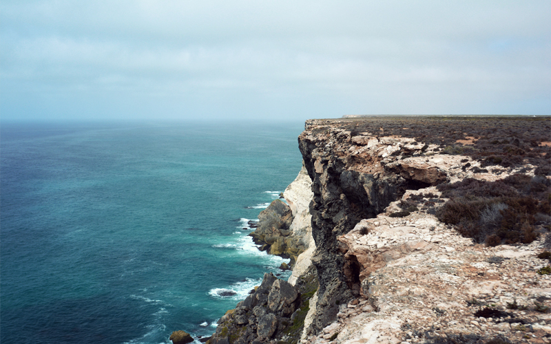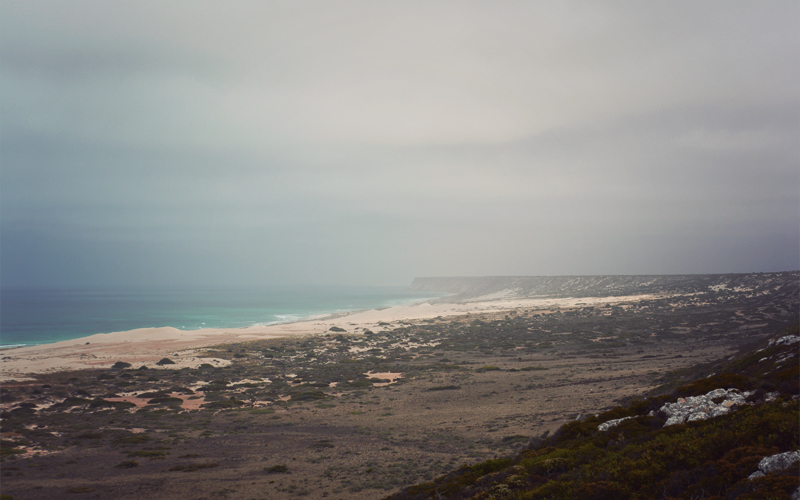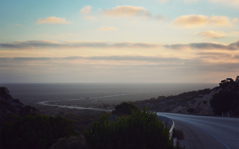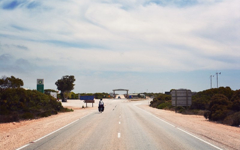 For miles after, we ride with the sea visible beyond the little hills off to our left. The cloud cover soon turns so thick that it blocks out the sun entirely, making it feel like we're on the Northern California coast. As we approach the border with Western Australia we try to guess which road train drivers are on speed based on the combination of how fast they drive, whether or not they wave back to us, and what kind of clothing they wear (a tank top is a definite yes).