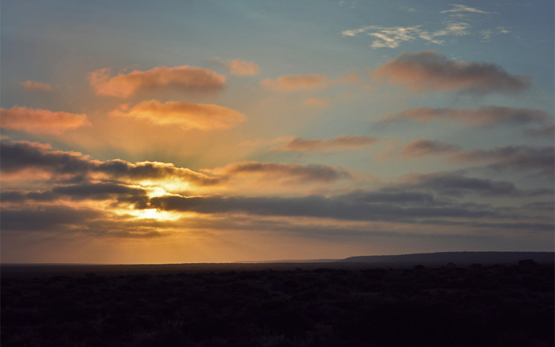 After a drop down from the hill on which Eucla sits (cleverly signed as Eucla Pass), we coast onto a featureless plain that stretches farther than we can see. Within minutes the sun drops below the shield of the low clouds and into a band of haze that forms a kind of thin screen, allowing us to look straight into it as the burning ball of orange approaches, crosses, and then disappears beyond the horizon. Out here there are no cars or trucks or RVs, nor houses or farms or fences. It's just two crazy Americans on bicycles who never imagined they'd actually be here, but now that they're here can't imagine being anywhere else.