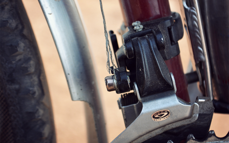 Kristen's front derailleur issues are also still there when we wake up. And on closer inspection we realize that it's not a matter of making minor adjustments to the alignment, because the cable itself has frayed and is starting to come apart. At best, half of the strands of the cable remain held in place by the tensioning bolt. It's the exact sort of issue we hoped to avoid by having the bikes checked out in Adelaide, but the problem was either missed or ignored, so now we have to deal with it out here. To help us keep going at a decent speed until we have a chance to replace the cable, I pull up as much tension as I can using the barrel adjuster up near the handlebars. This lets the chain clear the derailleur and allows Kristen to once again use the full range of the cassette in the middle chain ring.