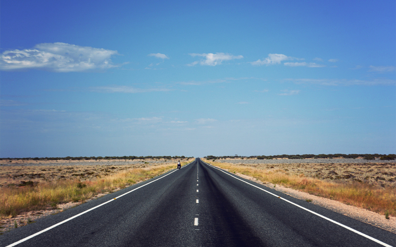 We pedal not on the shoulder but in the smooth groove in the left third of the traffic lane formed formed by the tires of the hundreds of thousands of cars, trucks, motorhomes, and road trains that have come before. The bushes that stretch off to the horizon are a little more brown in color now, we see grass in between the bushes in greater amounts than we have anywhere else on the Nullarbor, and big stones and small boulders begin to appear as if from nowhere. Every day out here the landscape looks subtly different than it did during the day before, but it's only at bicycle speed that you can appreciate the changes. In a car it would all blend into one seamless mass, and you'd instead find yourself thinking only of the next meal, the next bathroom, the next gas station.