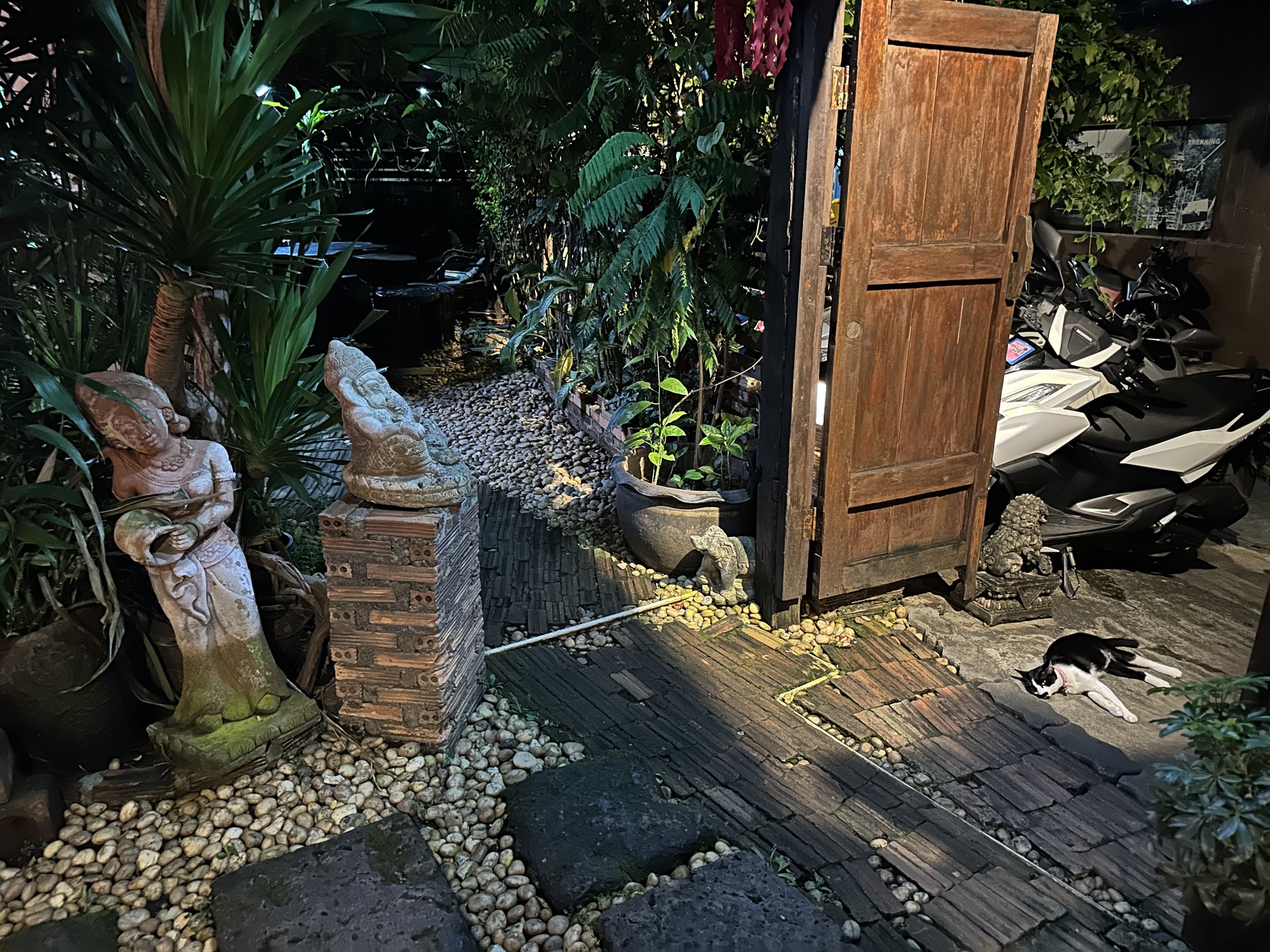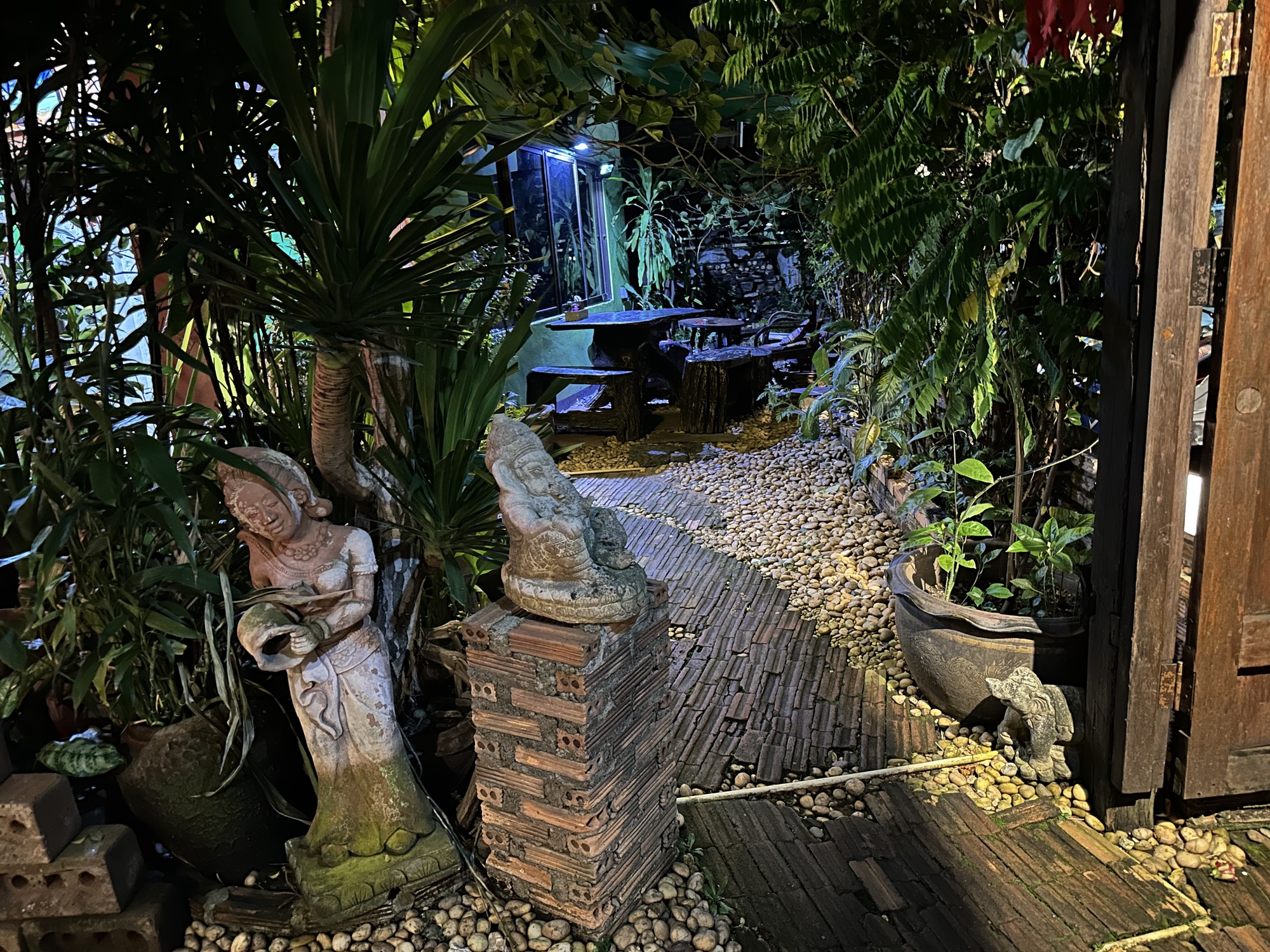 We are having a wonderful time getting reacquainted with the many charms Chiang Mai offers. One does not have to go far from one's guest house to be immersed in them either. Our guest house, with its odd name - All In 1 Guest House - has a near hidden entry from the tight little soi (lane) through big thick always open wooden doors into a mass of vegetation which surround an inner courtyard. Tiny fish seem very happy in their little worlds of miniature lily pads in small ponds and containers whereas big Koi show off their flashy colors in a bigger pond. Vines reach out and pull you further inside to the reception desk.
