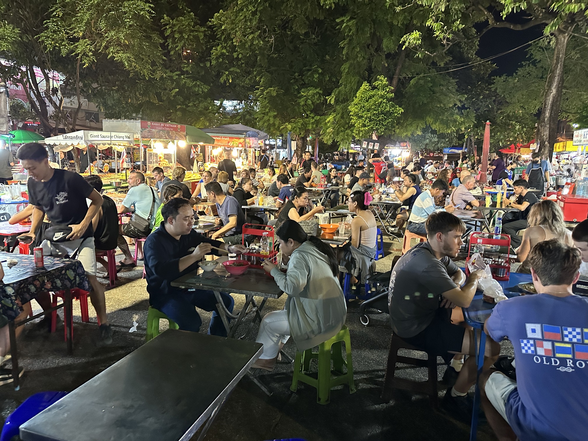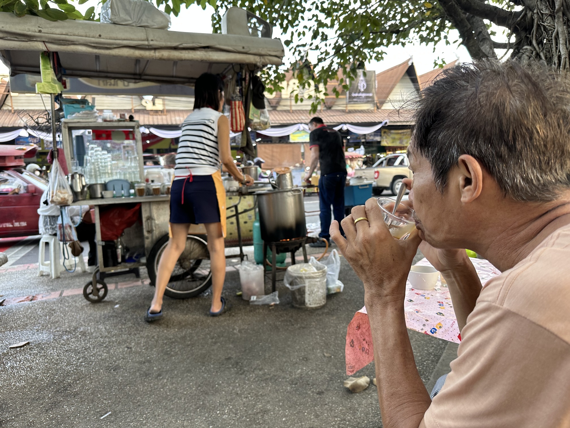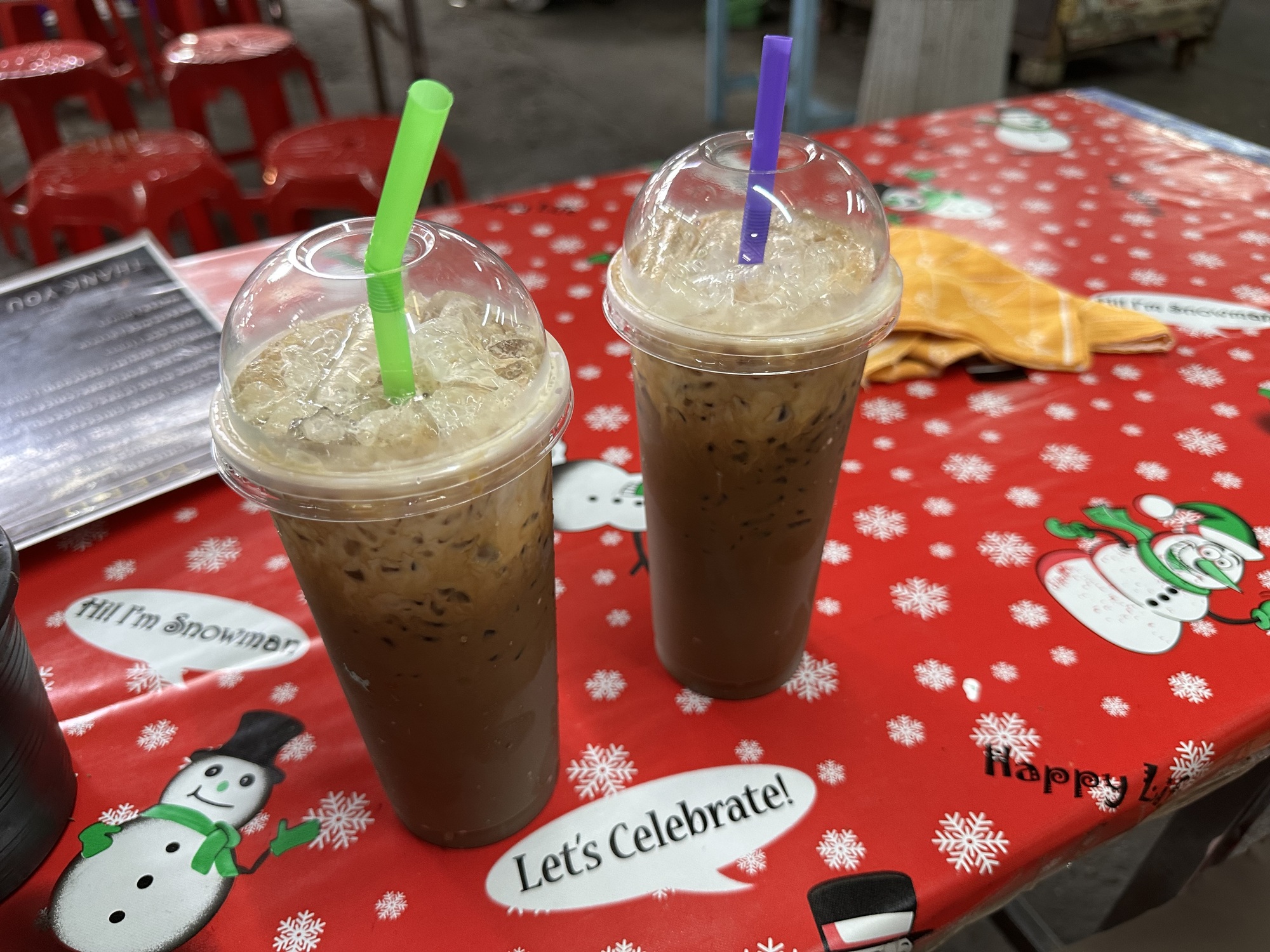 We found our favorite old style, 60 cent, Thai coffee from a street stall and in the evening we had our dinner outside on stools at a rickety metal table next to the ancient bricks of Chiang Mai Gate. The food is always delicious but it is enhanced by the ambiance which is pure peaceful Chiang Mai.