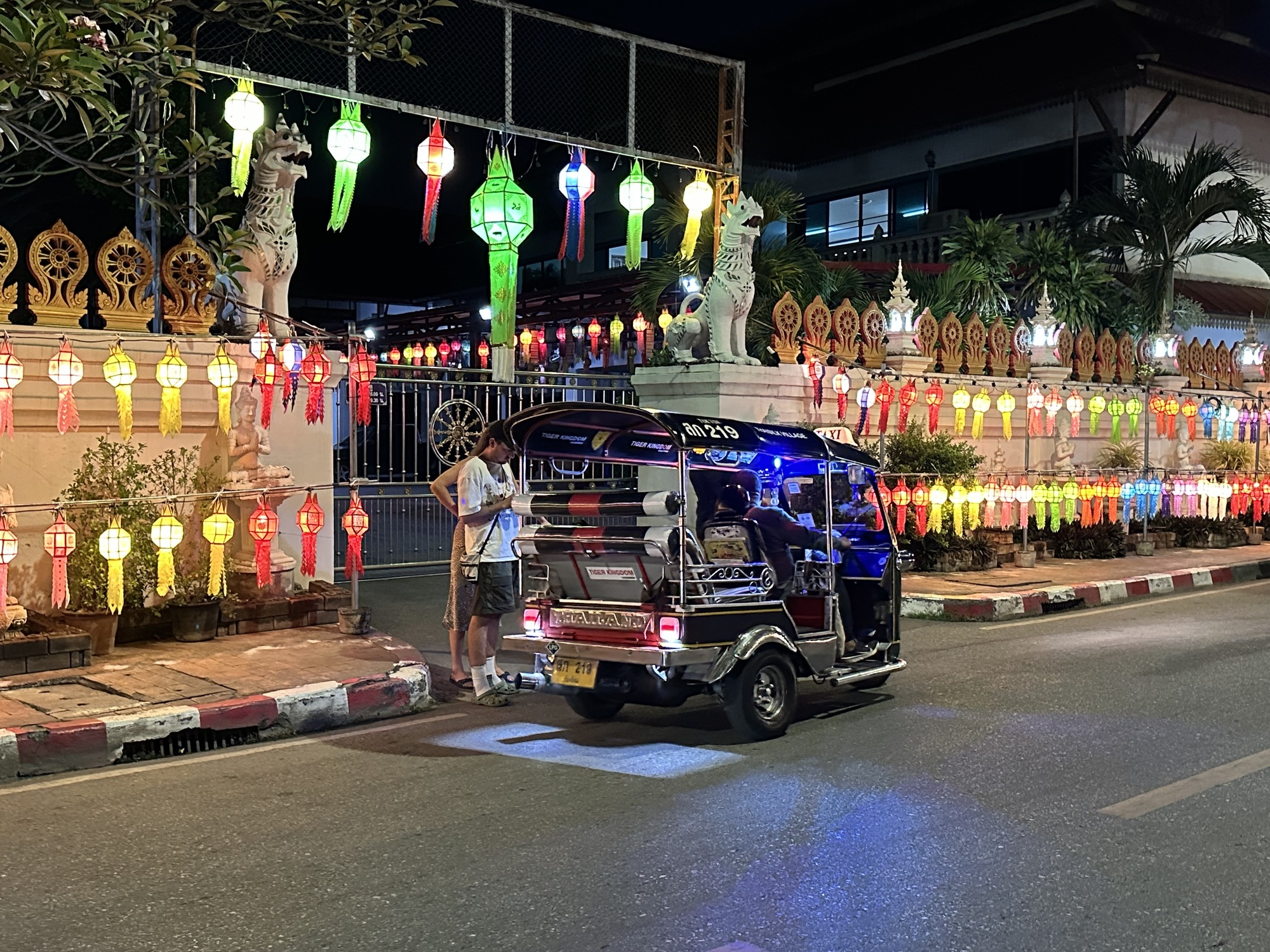 The other part of Loy Krathong was absolute craziness. Fifty one years ago I was a student at Chiang Mai University and I don't remember hardly any tourists in the city for Loy Krathong. I remember vividly wild young Thai boys lighting crude homemade skyrockets which they then dropped on the ground right in the middle of crowds of people in the streets. Sky rockets whizzing around at eye level was not my idea of fun. It was terrifying. I have no idea if they still do such things but we aren't sticking around to find out. We planned from the start to ride our bikes to Lamphun just 25 miles away where there will still be a Loy Krathong festival but with far fewer people and be more subdued and beautiful which is the way Loy Krathong should be.