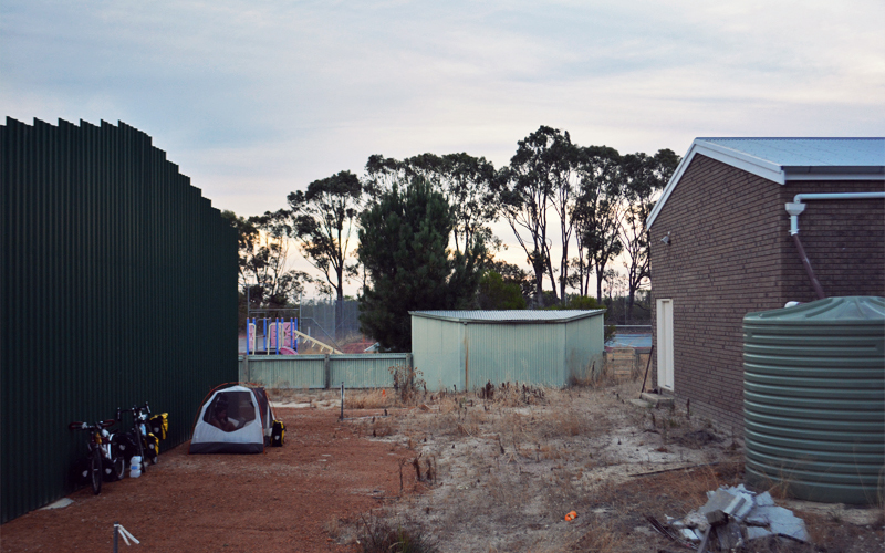 To the sound of the wind passing through the trees and road train engines cranking hard on the highway, that's where we watch day fade into night and lay down our heads without a single care beyond who's most responsible for making the tent smell so god damned bad.