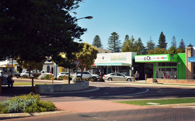 The powerful stink of low tide guides us into town, where the hardware stores and gas stations and John Deere dealerships around the fringes soon give way to a broad blue bay lined with golden sand beaches and backed farther on by expensive, modern-looking condos and vacation houses. It's a place of Comfort Inns, Best Westerns, Subways, and other international chains that we've seen next to nowhere in Australia. And yet here they are in Esperance, hundreds of miles from the next town of a similar size, standing guard over the waterfront because that's what the tourists who travel here rely on to feel comfortable and safe and grounded.