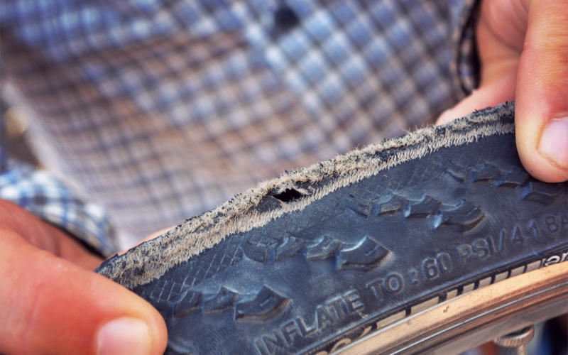 Two and a half miles farther on, the back tire blows out again, in the same spot. The rim tape solution only managed to delay the inevitable. We're once again dead where we stand, with no hope of a quick fix on the horizon.