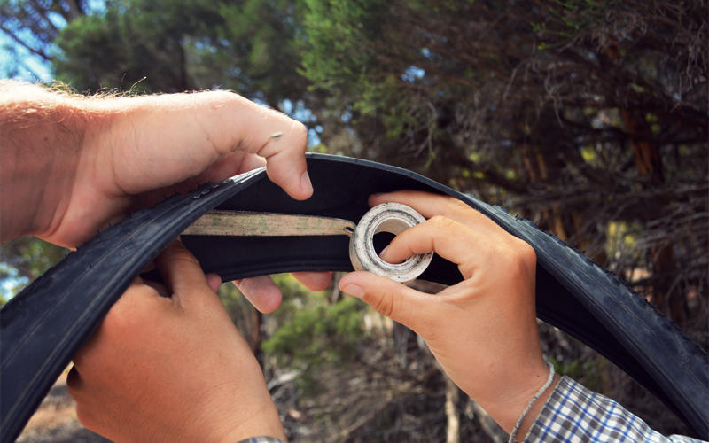It takes fifteen minutes to get the combination of tire, tube, strip, and tape properly aligned and held together tight, but we manage to make it work. When we reinflate the tire and roll the bike back and forth a few times, our patches of both the tube and the horribly worn tire hold fast. It looks like our fix might work after all. We load all of the bags back onto the bike and return to our push to the north.