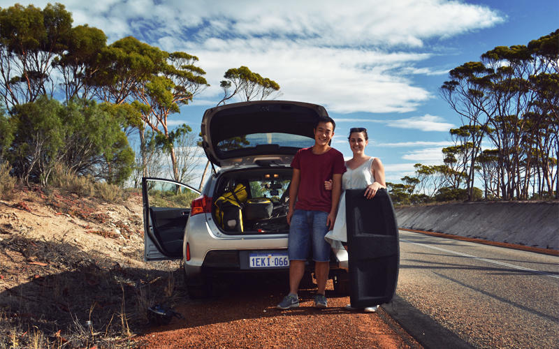 A few moments later we introduce ourselves to Lena and Alex. She's from France and he's from Argentina, and they met each other while working in Melbourne. But both of them came to Australia on short-term working visas, and Alex's is about to run out. He only has a week or two left in the country before returning home to Argentina, after which time there's a chance he may never see Lena again. To make the most of the time they have left together, they decided to fly to Perth, rent a car, and spend four days heading down to Esperance and then back to Perth by way of Norseman. They've never before driven this road and they never will again. It's only by the sheer chance of fate that we met them at all.