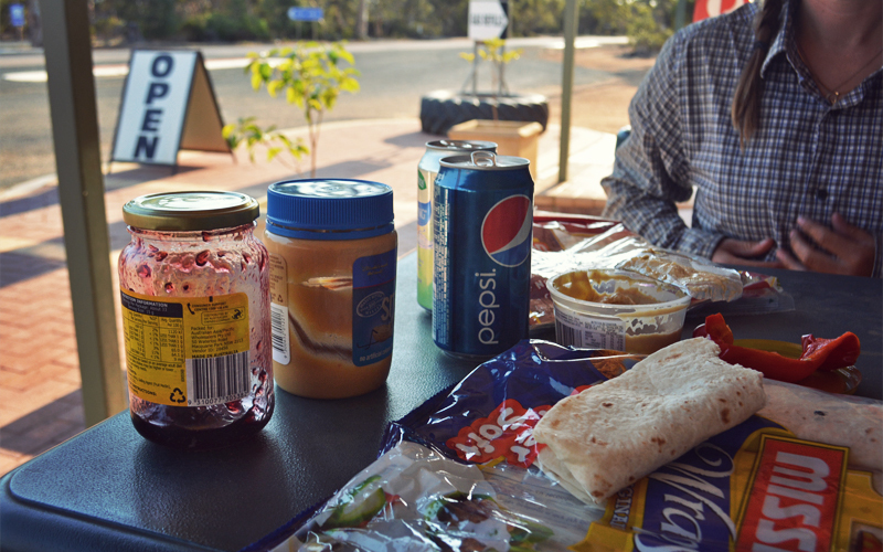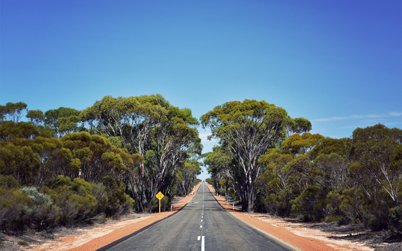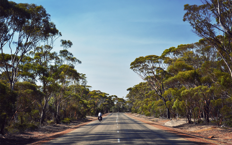 Soon the shorter and steeper hills give way to more gentle rises with long flat stretches in between them. For some reason we can't figure out, there are far fewer cars and caravans and road trains on the highway today, making the riding far less stressful and aggravating than the last time we rode this way. This gives us the chance to relax, to focus less on our mirrors, and to instead think about our final 300-mile run to the west coast of Australia.
