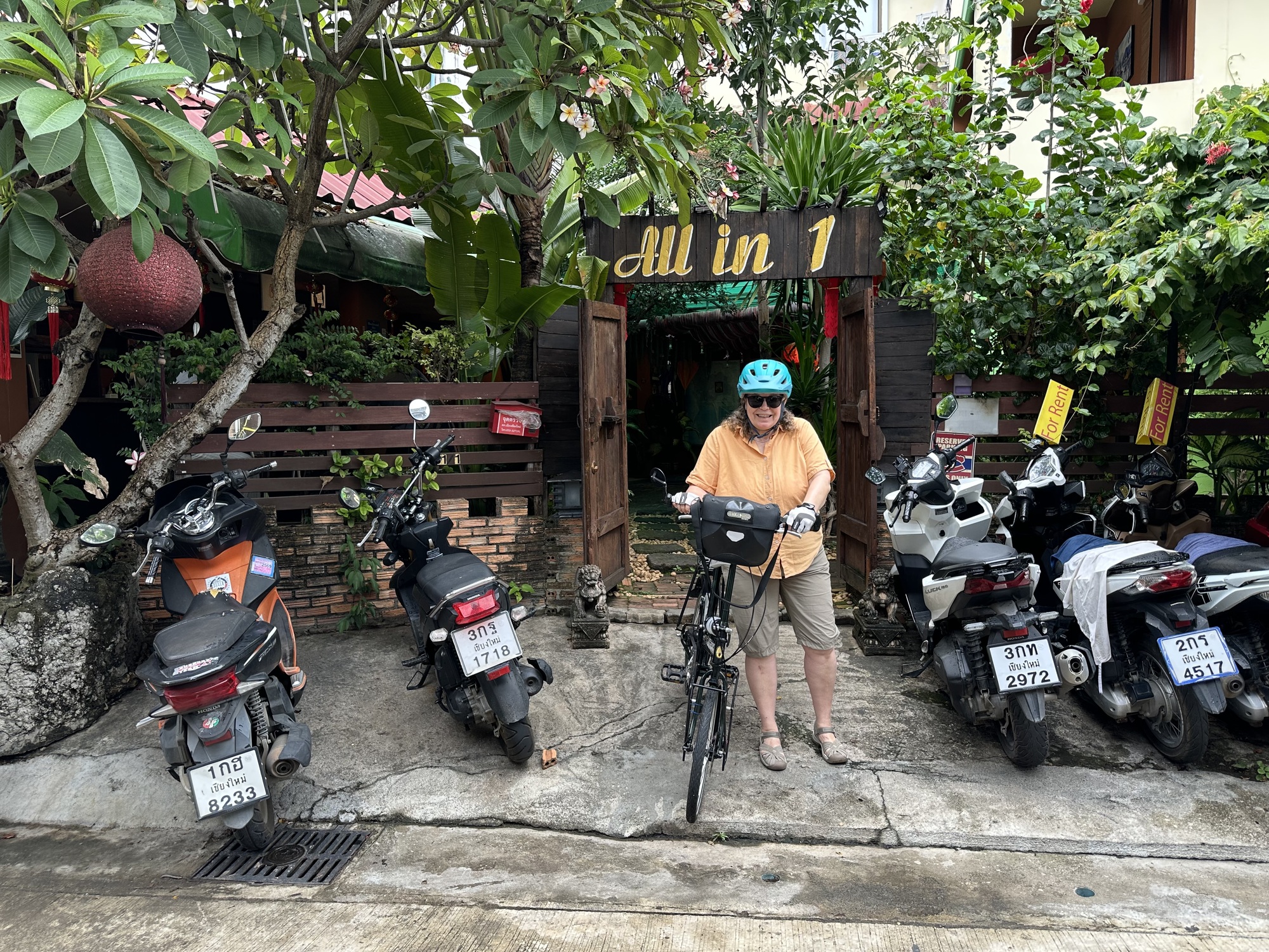 My phone situation had been an irritant. I paid a higher-than-necessary amount to get a Thai eSIM onto my phone before we left home so we could hail a Grab at the airport at midnight. Well, that didn’t work because the eSIM didn’t work even though it showed up with bars and everything. So we brought our bikes down the two flights of stairs, did the shakedown cruise down the soi (we assembled them perfectly!) and cruised on out to the AIS store. But first, jok.